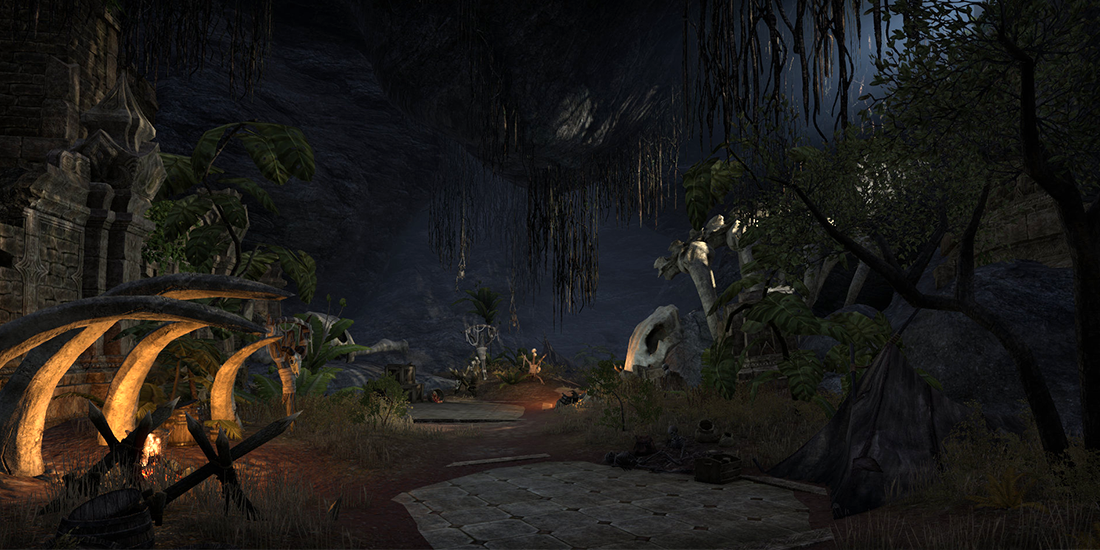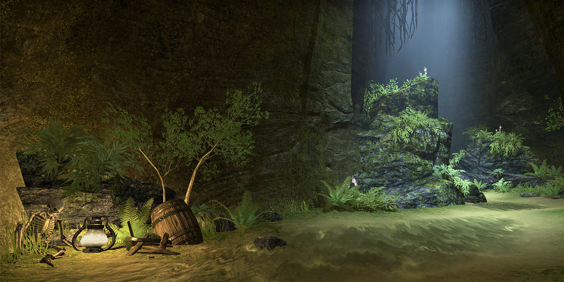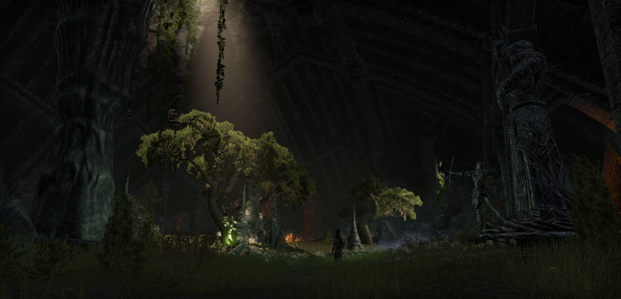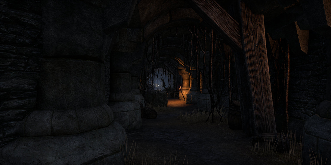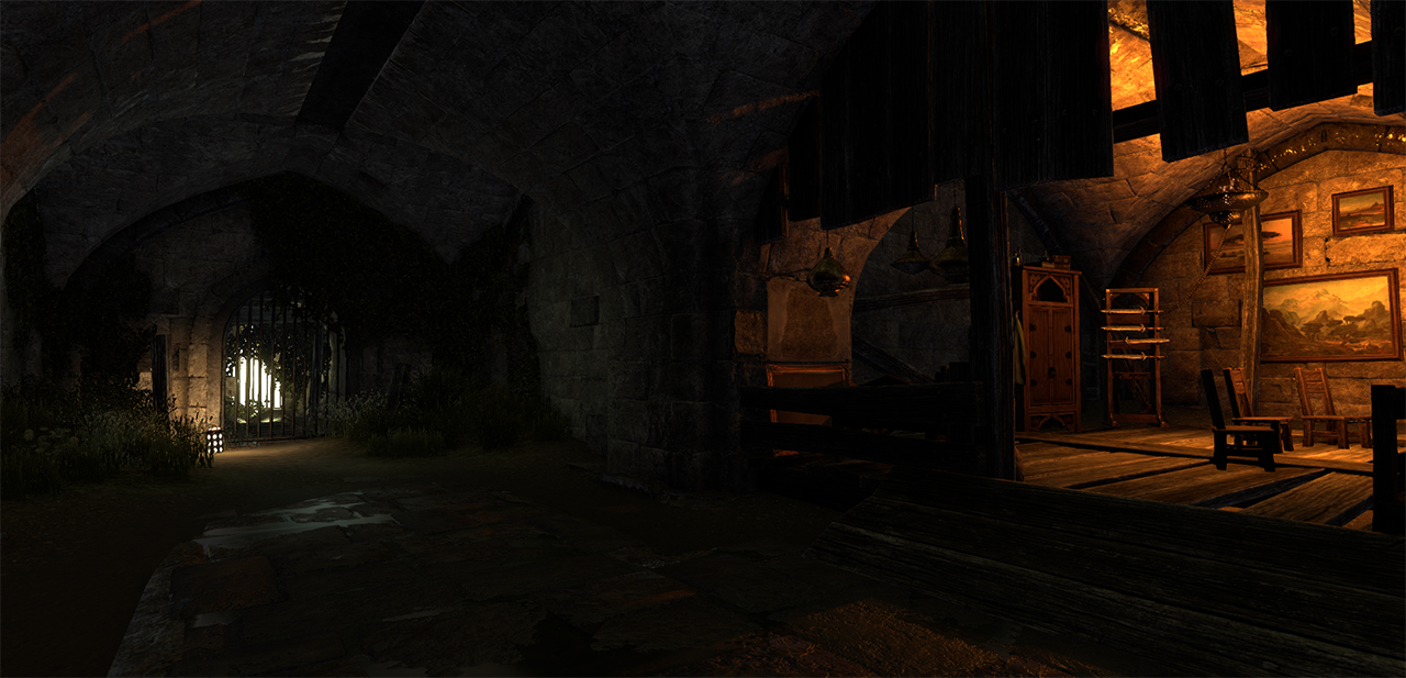 Under the surface of Tamriel lurks danger and dread that's brimming with just as much life as it's surface. Through cracks in ceilings and long dead adventurers clutching still burning torches, interiors allowed much more metric room for vibrant lighting and dense scene propping to tell even more elaborate and visually stunning stories than the open lands above.