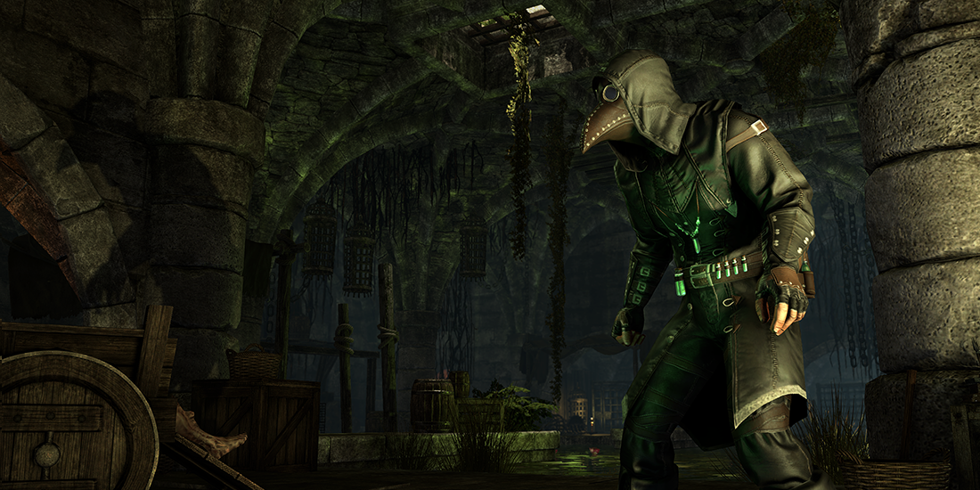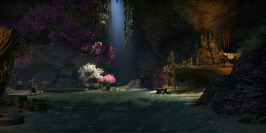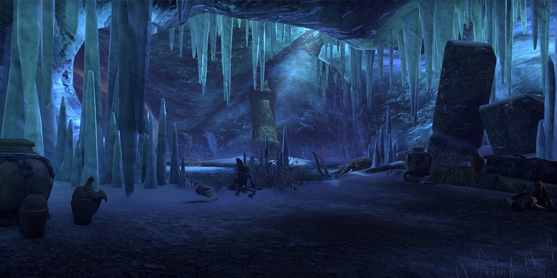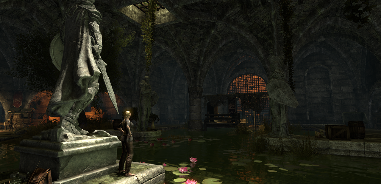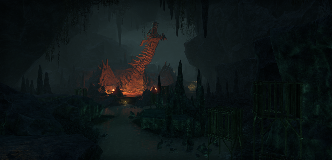 Under the surface of Tamriel lurks danger and dread that's brimming with just as much life as it's surface. Through cracks in ceilings and long dead adventurers clutching still burning torches, interiors allowed much more metric room for vibrant lighting and dense scene propping to tell even more elaborate and visually stunning stories than the open lands above.
