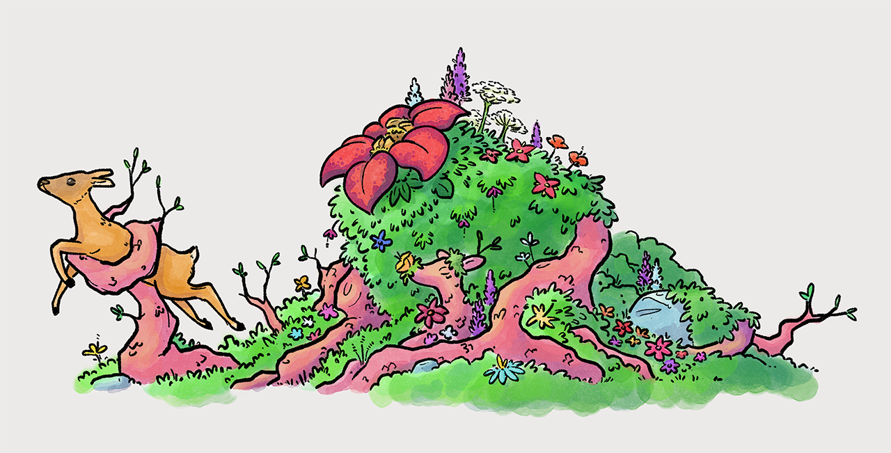 " A blossoming mound weaves it's way through forests and woods, spreading verdant and color as it goes. Appearing as a massive tangle of vines and bushes covered in flowers, fruits and blossoms, extending tendrils in all directions around it. The blossoming mound is considered by some cultures to be a kind of benevolent forest spirit, akin to the dryad." - Ash McAllan
