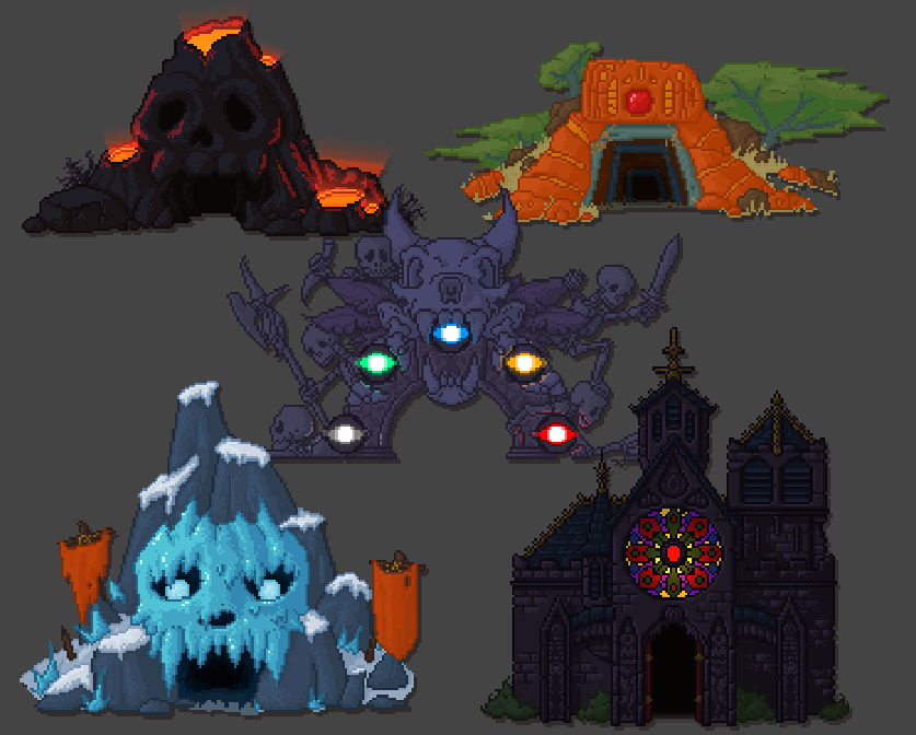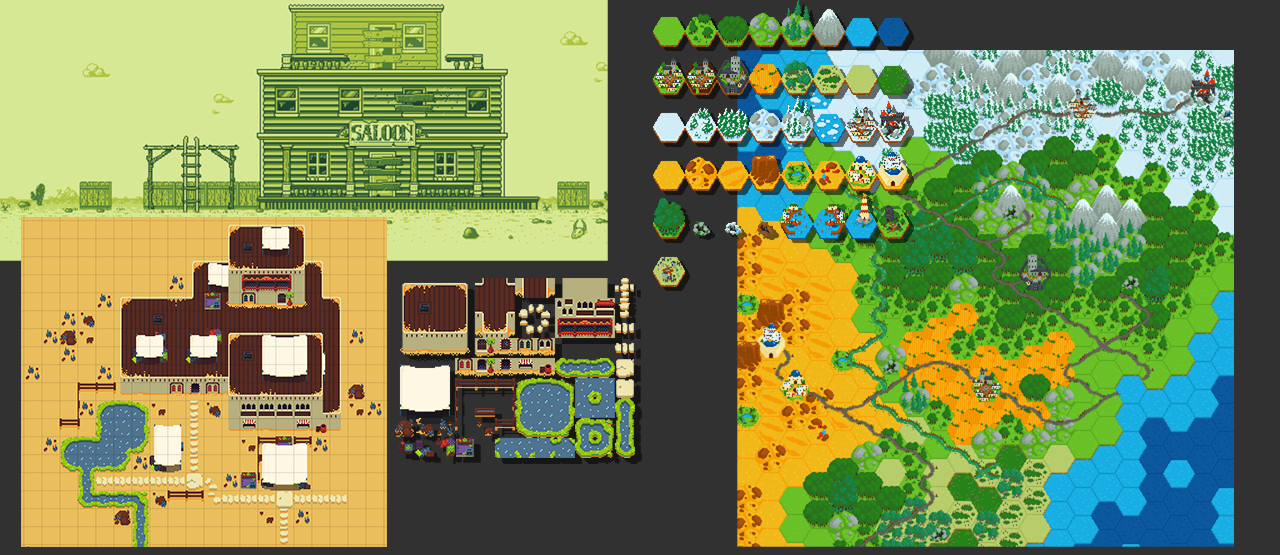 One of my favorite pixel practices is making tilesets! I love to make intricate environments that I can craft out of kit bashing bits together. Here's a few from both game jams and just personal projects.